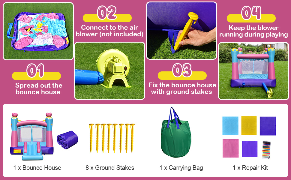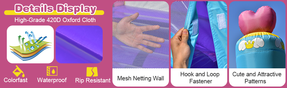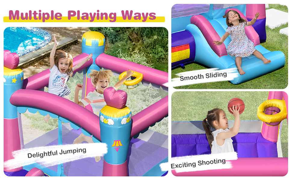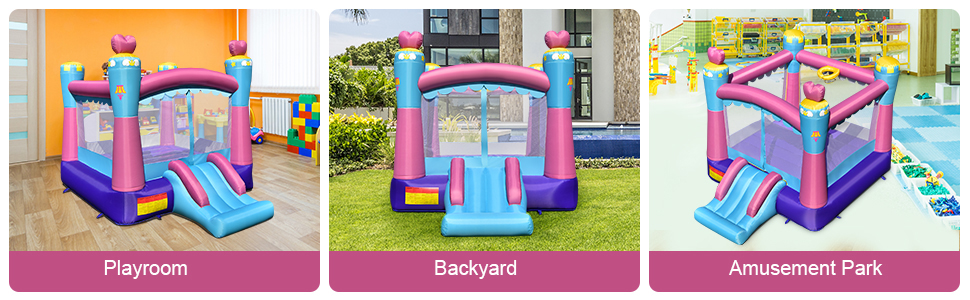 The bounce house comes with smooth slide, huge trampoline and basketball hoop for multiple fun. They can jump, slide and shoot in different areas, which brings extra entertainments to kids' childhood. After use, you can turn off the blower to take the bounce house down and store it in the carrying bag. Moreover, the combination of unique princess theme and multiple colors will definitely attract kid's attention at first sight. It is a perfect inflatable bounce house for your kids to enjoy leisure time!